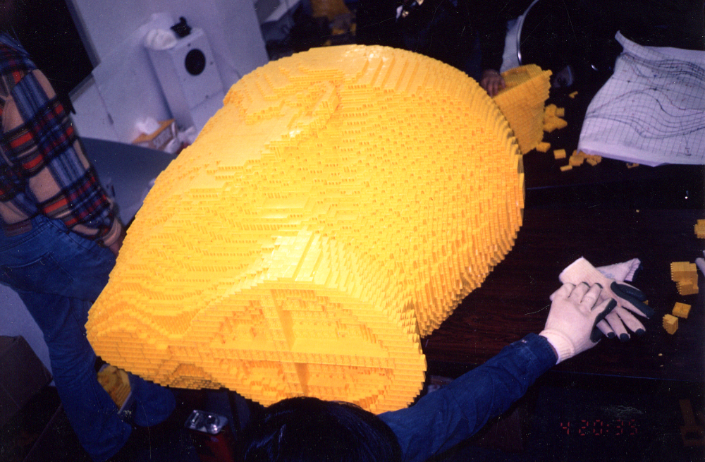 「キス」男女と「ドッキング」アポロとソユーズの二つのオブジェをブロックで作りました。 使用したブロックは全部合わせて8万個です。 男女の顔を製作するのは特に時間がかかりました。パソコンがない時代、最初にスチレンボードを積層して、男性、女性のデッサンを整え、次にこのスチレンボードをバラして、アウトラインを原寸にのばしてブロックの設計図を作りました。 その原寸図面のアウトラインに沿ってブロックを組み立てていきます。ブロックはハンマーで打ち込まないと入らなくなっていきました。 オブジェの出来上がり寸前になって「ドアから出ない」ことが判明。斜めに倒してぎりぎりで通過することが出来ました。