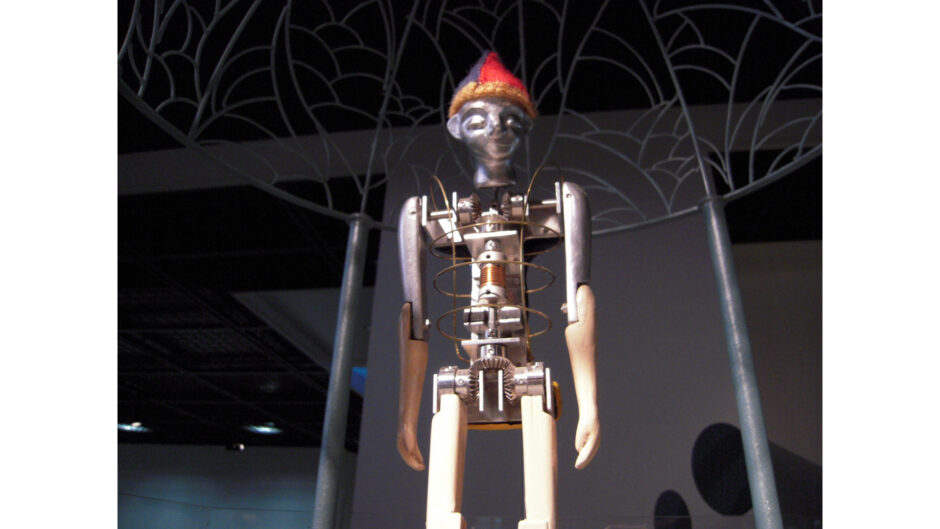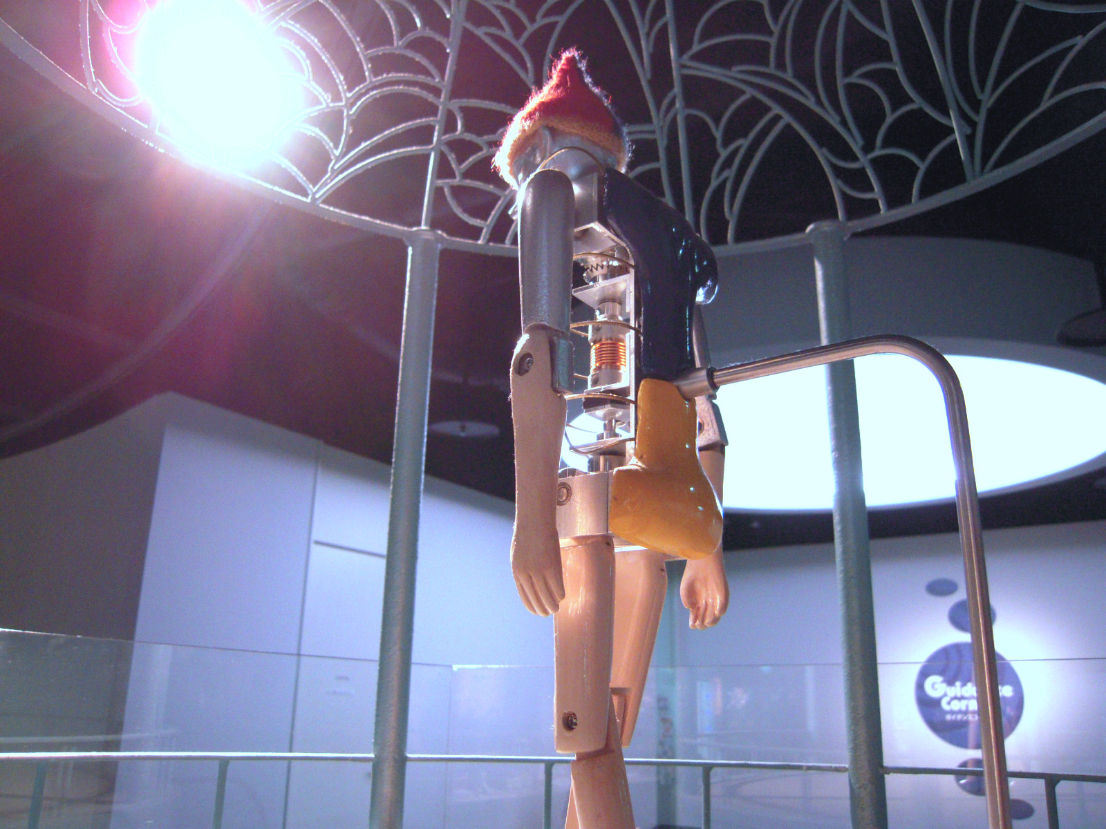 この歩くロボットは磁石による「操り人形」であり、人形本体には特別な動力を持っていません。 床下の磁石のベルトコンベアーの駆動で、足の下に装着された磁石が動き、体全体を動かしているのです。 古き良き時代の「操り人形」の感触と、技術の進歩による正確な「メカニズム」、 そんな「過去」と「未来」を織り交ぜながら、私達はこの作品を制作しました。 このオブジェは「懐かしい」という想いや、「ユーモラスな動き」を特に重視して製作されています。 このロボットはただ歩くだけですが、そこに人形独特のしぐさや、偶然の動きを発見していただければ幸いです。 彼はいったい誰なのか、彼はこれからどこへ行くのか、皆さんの想像でイメージを膨らませてください。 アイザック・アシモフ、宮沢賢治、ピノキオなど、過去の寓話のイメージも盛り込んでいます。 古いサーカス小屋、星空の下、ありふれた街角、この不思議なロボットの歩いている場所を想像してみてください。 それでは中央のドアノックを叩いて、そっとこのロボットの目を覚ましてください。