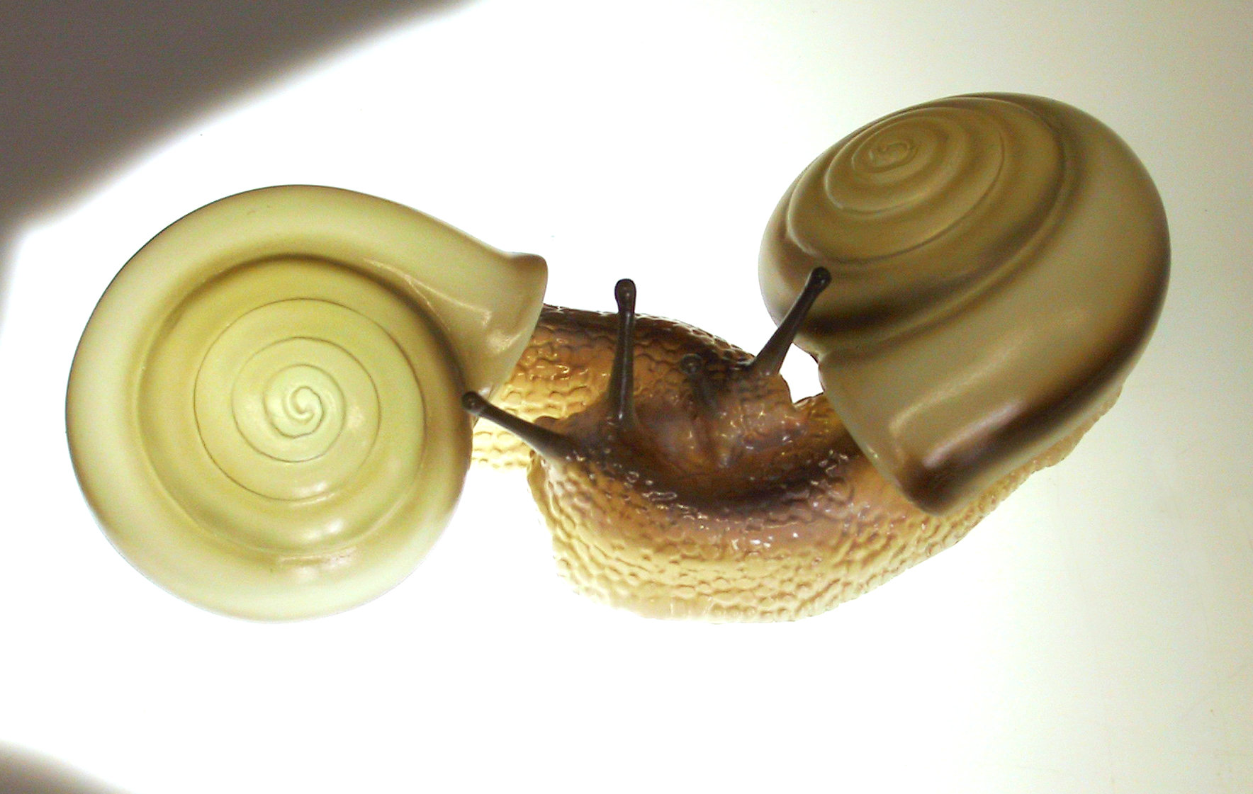 ミドリムシ、クラミドモナス、といった生殖行為を行わない生き物でも恋愛をするようです。 カタツムリは雌雄同体で、生殖行為をするときにどちらかがオス、どちらかがメスになるんですよね。 今回の模型はそれを表現する模型でした。 軟体動物や原生動物は好きなので、粘土原型を作るのは楽しいです。